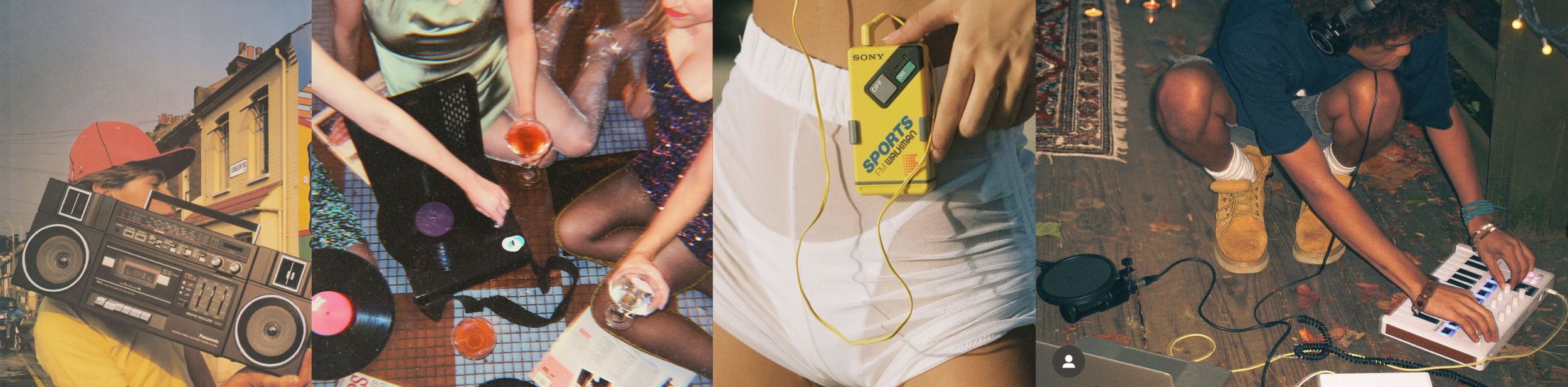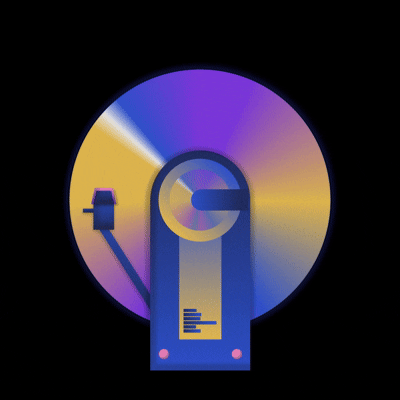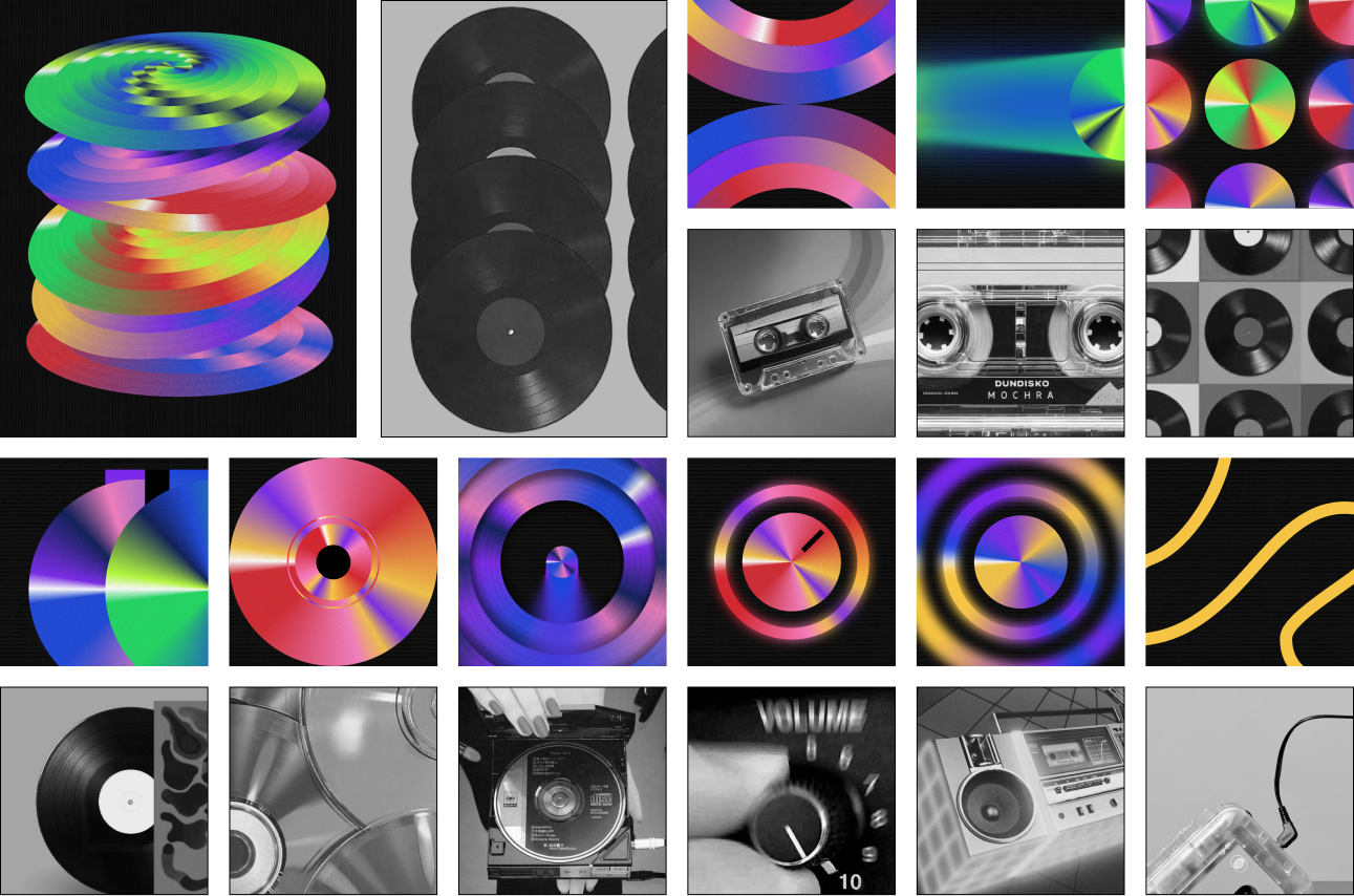The design system draws from the iconic geometry of music technology—spinning discs, cassette windows, knobs, and circular motion.